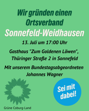 Am 13.07. möchten wir in Sonnefeld den Grünen Ortsverband Sonnefeld-Weidhausen gründen. Um 17:00 Uhr geht es los im Gasthaus "Zum Goldenen Löwen" in Sonnefeld. Wir freuen uns, dass sich einige engagierte Mitglieder in diesem Bereich für Klimaschutz, Gerechtigkeit und vieles mehr einsetzen möchten.