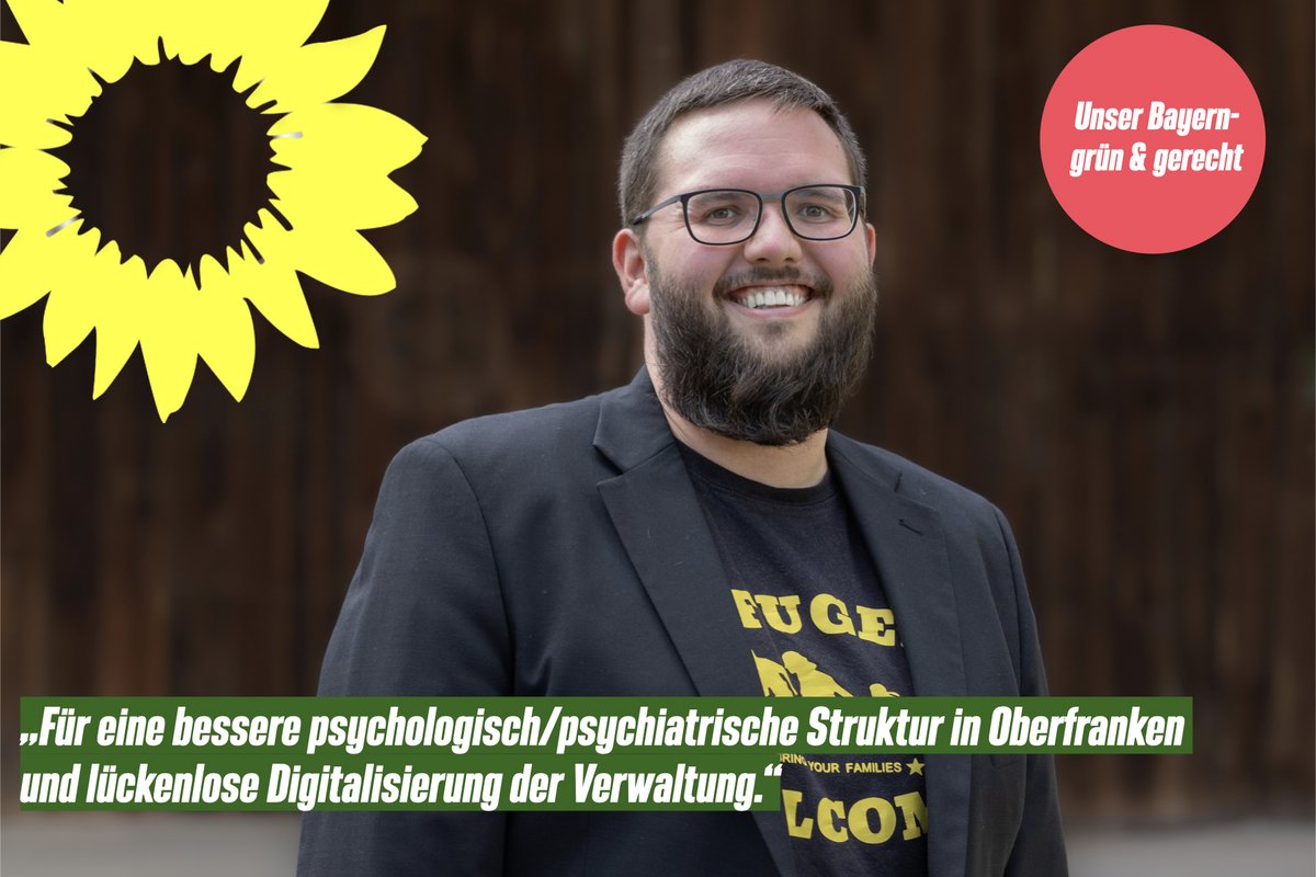 Mein Name ist Kevin Klüglein. Ich bin Fachinformatiker im Landratsamt und bin seit sieben Jahren bei den Grünen aktiv. Nachdem ich jahrelanger als Vorstandssprecher tätig war, bin ich jetzt Stadtrat in Coburg. Ich weiß, was es bedeutet, sich als junger Mensch auf lokaler Ebene zu engagieren und für Themen zu kämpfen, die eigentlich aussichtslos scheinen, da sich nicht nur Coburg oder Oberfranken verändern muss, sondern die ganze Welt.